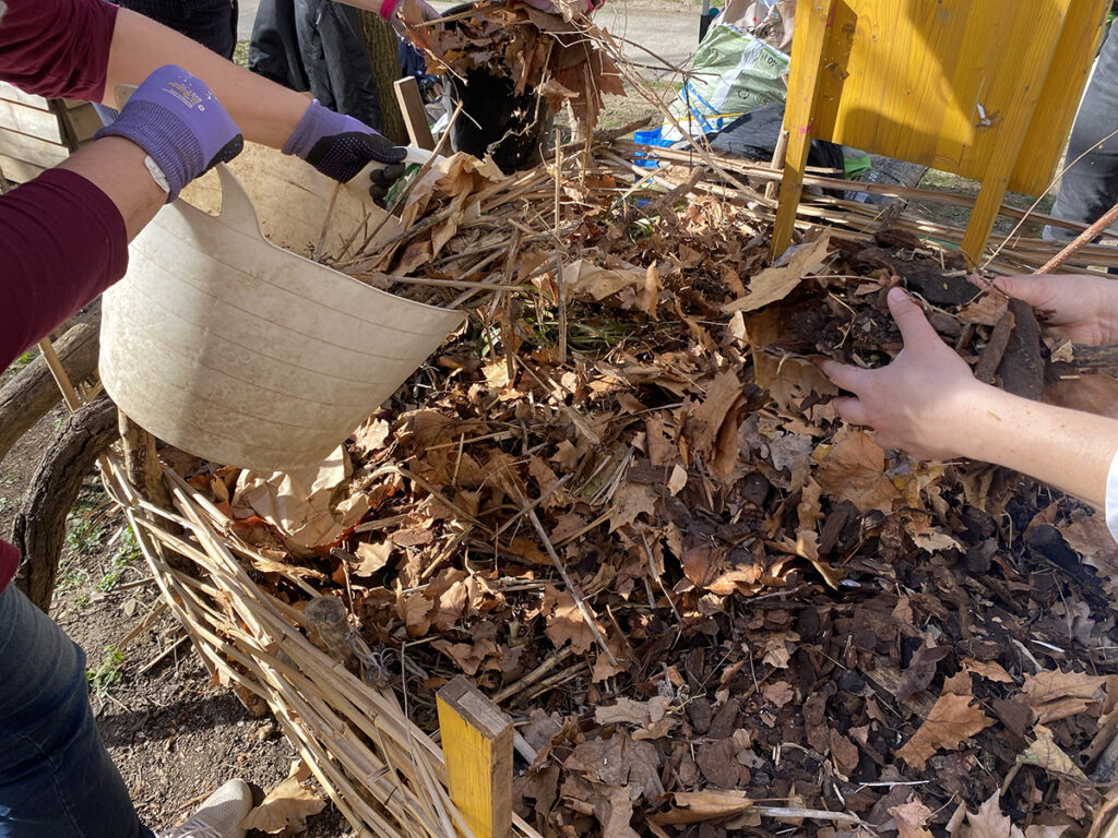 Wir machten Übungen, um unseren Kompostgarten auf sinnliche Weise kennenzulernen, um ihn nicht nur zu sehen, sondern auch auf viele verschiedene Arten zu spüren – zu hören, zu berühren, zu riechen, zu schmecken, … Wir kompostierten trockene Pflanzen, um Platz und Licht für kleine, wachsende Pflanzen zu schaffen. Wir haben sogar schon etwas Spinat, Rucola und Salat gesät.