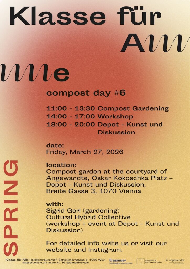 *Das compost collective ist ein offenes Kollektiv. Wer sich aktiv an Komposttagen und der Kompostpflege beteiligen möchte, ist herzlich eingeladen, mitzumachen! Die Mitglieder des Kollektivs übernehmen die Verantwortung für den Bio-Kompostgarten im Hof der Angewandten am Oskar-Kokoschka-Platz. Außerdem organisieren und betreuen sie Kompost Tage und skill sharing sessions. Wenn du Interesse hast, mitzumachen, komm zu den Kompost Tagen oder kontaktiere uns!