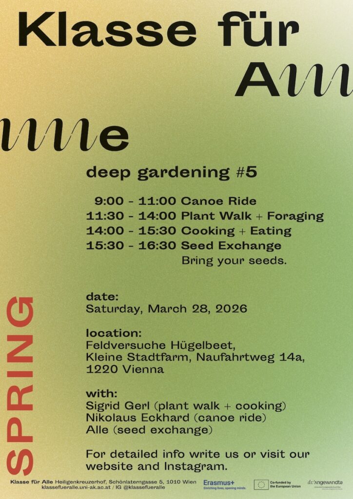 Wir beginnen den Tag mit einer morgendlichen Kanufahrt auf der Donau, geführt von Nikolaus. Später wird Sigrid uns auf einen Spaziergang rund um die Farm führen, um Pflanzen genau zu betrachten und ihnen aufmerksam zuzuhören. Wir werden Kräuter für unser Mittagessen sammeln und von den vielfältigen (Pflanzen-)Gemeinschaften auf der Kleinen Stadtfarm sowie voneinander zu lernen. Eine Saatguttausch und ein gemeinsames Mittagessen runden den Tag ab.