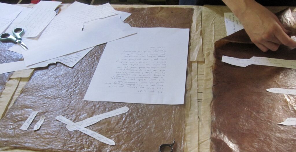 In diesem letzten Workshop treffen wir erneut auf die transformierten SCOBYs (von feuchter und schleimiger Materie zu trockenem „Bioleder“). Wir ernten die Worte und Symbole, die wir gemeinsam geformt haben, und betrachten das Netz der Entsprechungen, das wir während der vergangenen Workshops gewoben haben. Wir komponieren, komponieren neu und dekomponieren das Material, indem wir Teile der Buchstaben ausschneiden und sie auf den getrockneten SCOBYs zusammenfügen, wodurch wir die Buchstaben transmutieren und ein großes Mosaik schaffen.